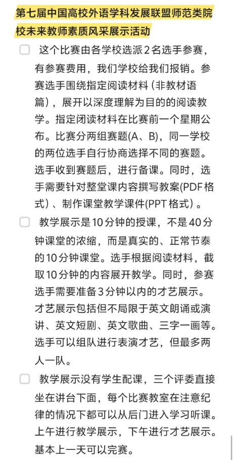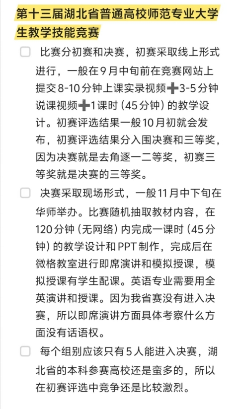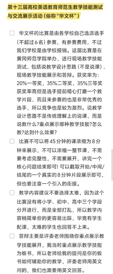 经历数次真实赛场,想给学弟学妹们一些建议:一、努力夯实专业基础。英语师范生需要具备扎实的英语语言基本功,包括准确的语音语调、丰富的词汇量、熟练的语法知识以及较强的听说读写能力。这不仅体现在即兴演讲和模拟授课的语言表达上,更体现在对教学文本的深入解读和分析能力上。二、深入研读课标与教材。对于英语师范生而言,必须认真学习和领会英语课程标准的核心理念,特别是英语学科核心素养的四个方面:语言能力、文化意识、思维品质和学习能力。在教学设计中,要将这四个方面的培养目标有机地融入到教学活动的各个环节中。三、设计创新且实用的教学环节。在教学技能竞赛中,一个创新且实用的教学设计是吸引评委眼球、展现教学智慧的关键。创新并不意味着追求花哨和形式,而是在深刻理解教学内容和学情的基础上,对教学环节进行巧妙的构思和安排,使其更具启发性、趣味性和实效性。四、善用多媒体与技术辅助教学。在当今信息化时代,善用多媒体和信息技术辅助教学,已经成为现代教师必备的一项基本技能。在教学技能竞赛中,一个制作精良、运用恰当的多媒体课件,不仅能够直观地呈现教学内容,增强教学的趣味性和互动性,